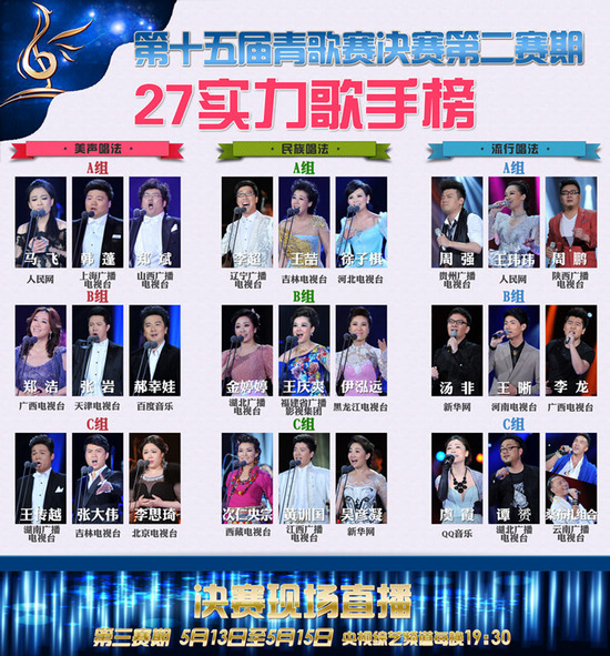 5月10日,第十五届青歌赛决赛第二赛期最后一场比赛顺利结束,经过连续6天的激烈角逐,本届大赛“27强”全部产生。本日直播所有选手比赛结束后,“27强”选手悉数登台亮相。