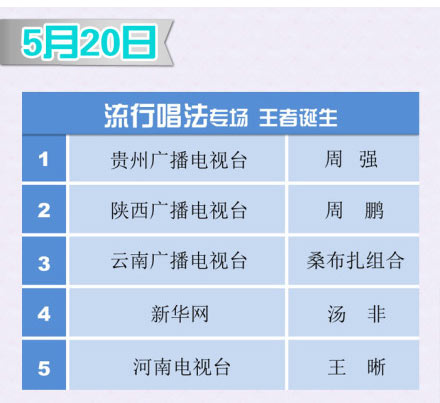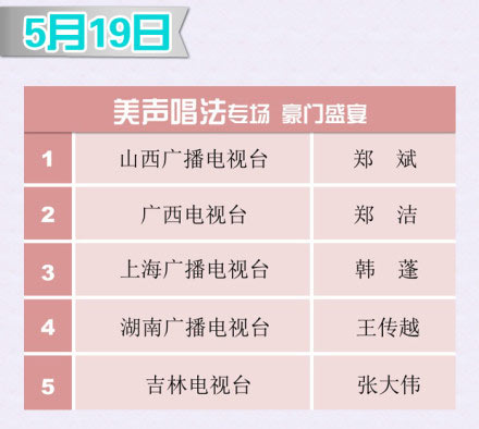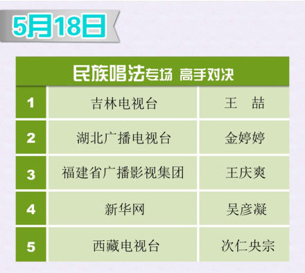 蓝色经典•天之蓝第十五届青歌赛史上最激烈的青歌赛决赛即将到来!5月18日民族组高手过招,5月19日美声组强者比拼,5月20日流行组王者争雄。三场专场比赛,各唱法5强选手将使出浑身解数,高歌猛进!每晚19点30分,尽情享受青歌赛为您带来的饕餮盛宴。巅峰总决赛,见证歌者加冕时刻!