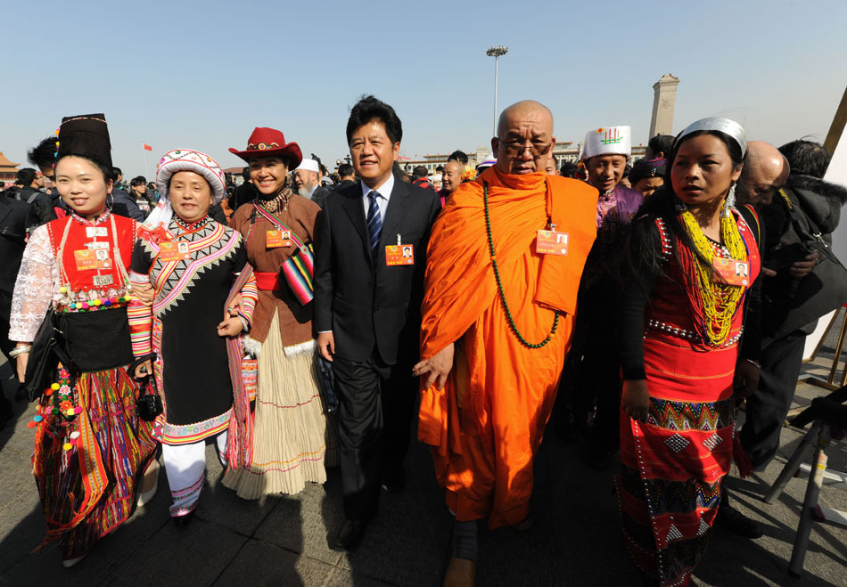 3月3日,中国人民政治协商会议第十二届全国委员会第一次会议即将在北京人民大会堂开幕。这是全国政协委员抵达天安门广场。 新华社记者 杨宗友 摄