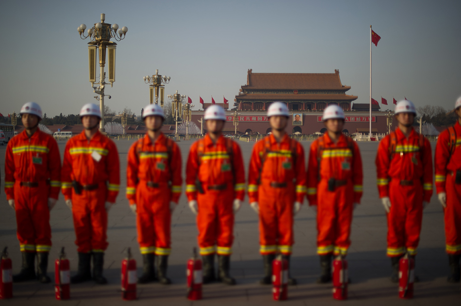 3月3日,北京,天安门广场上待命的消防队员。全国政协十二届一次会议当日开幕。