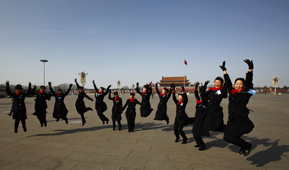 3月3日,北京,全国政协十二届一次会议开幕会前,服务人员在天安门广场拍照。