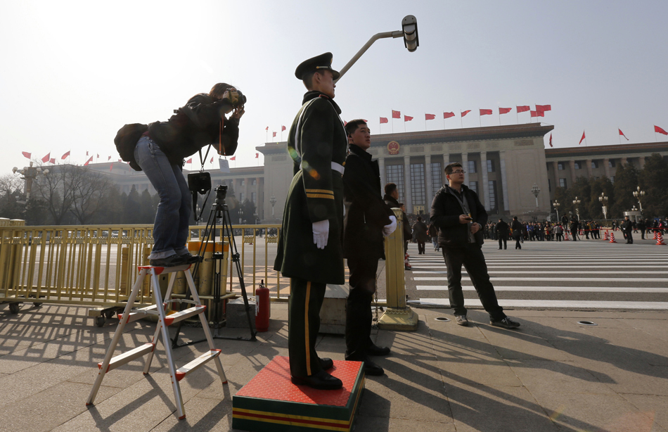 3月3日, 北京,一名记者在人民大会堂外执勤的武警身后拍照。全国政协十二届一次会议当日举行开幕会。
