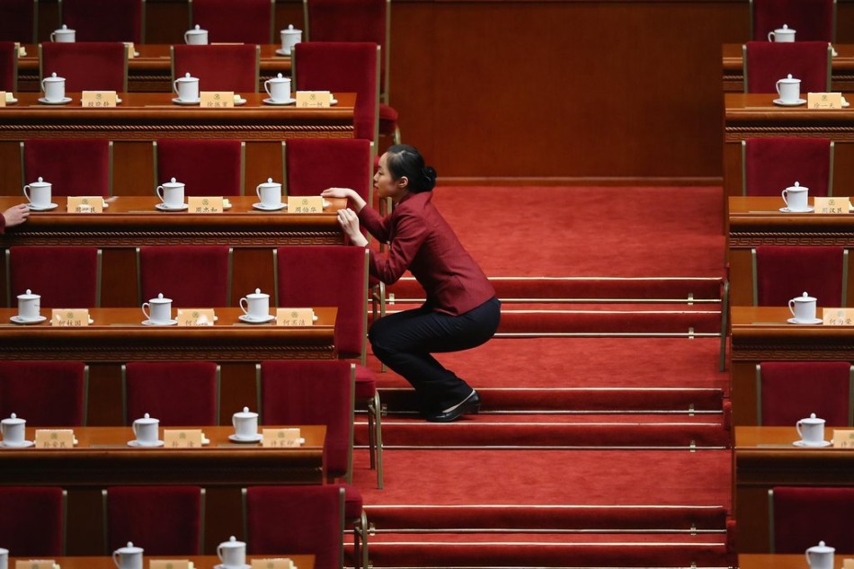 3月3日,北京,全国政协十二届一次会议开幕会会场,服务人员标齐茶杯放置位置。
