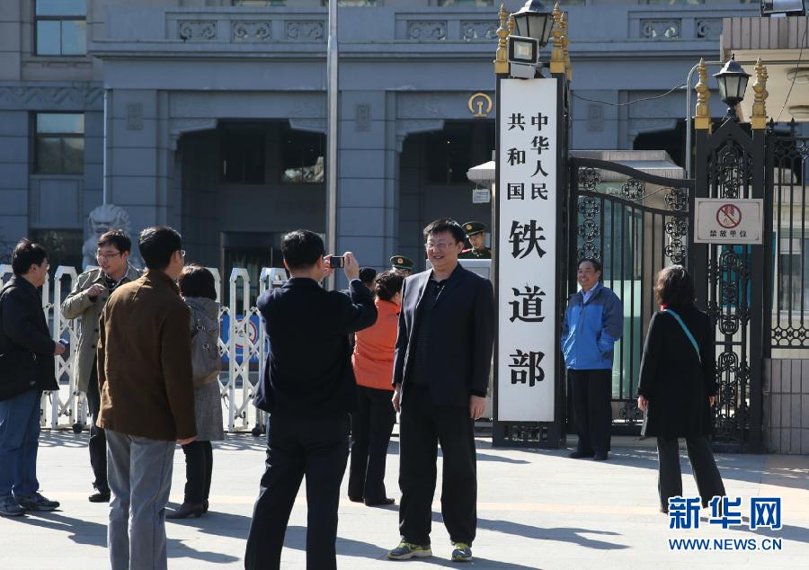 3月10日,人们在铁道部前留影。根据3月10日提请全国人大会议审议的国务院机构改革和职能转变方案,将不再保留铁道部,实行铁路政企分开。将铁道部拟订铁路发展规划和政策的行政职责划入交通运输部;组建国家铁路局,由交通运输部管理,承担铁道部的其他行政职责;组建中国铁路总公司,承担铁道部的企业职责。新华社记者 王申 摄