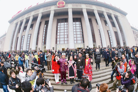 3月12日,全国政协十二届一次会议在北京人民大会堂举行闭幕大会。这是闭幕会后,委员们离开人民大会堂。