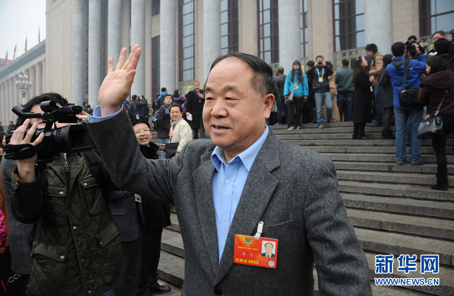 3月12日, 全国政协十二届一次会议在人民大会堂举行闭幕会。图为大会结束后,全国政协委员莫言离开会场时向记者挥手告别。新华网 翟子赫 摄