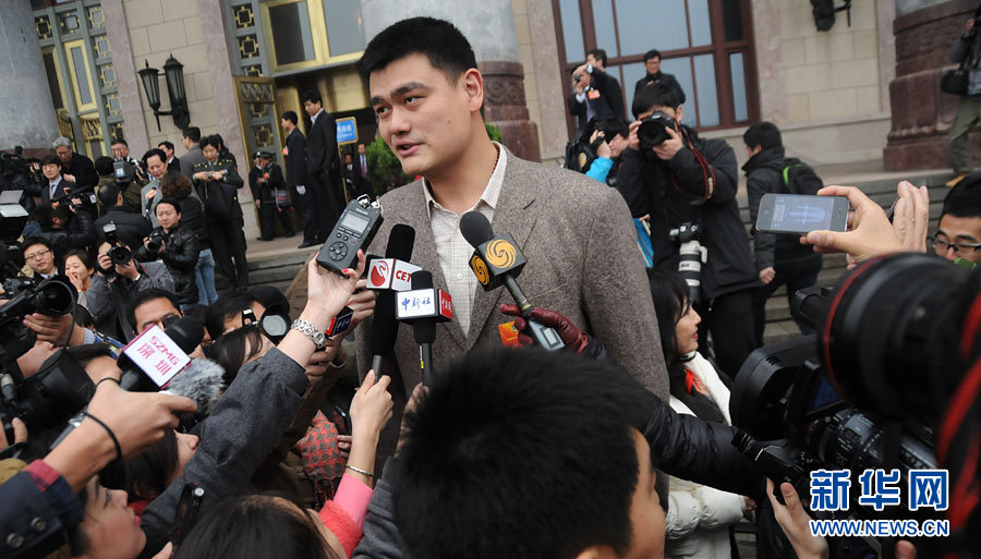3月12日, 全国政协十二届一次会议在人民大会堂举行闭幕会。图为大会结束后,全国政协委员姚明离开会场时接受记者采访。