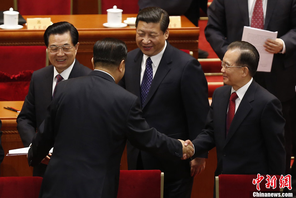 3月3日,中国人民政治协商会议第十二届全国委员会第一次会议在北京人民大会堂开幕。在大会结束后,胡锦涛、习近平、温家宝与贾庆林互致问候。中新社发 盛佳鹏 摄