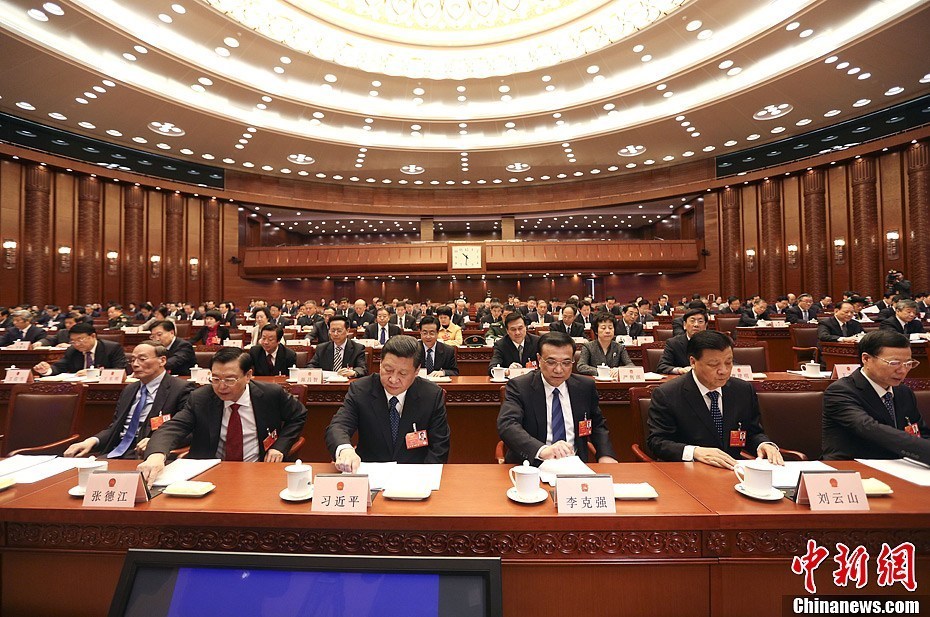 3月4日,十二届全国人大一次会议主席团在北京人民大会堂举行第一次会议。图为习近平等按表决器。中新社发 盛佳鹏 摄