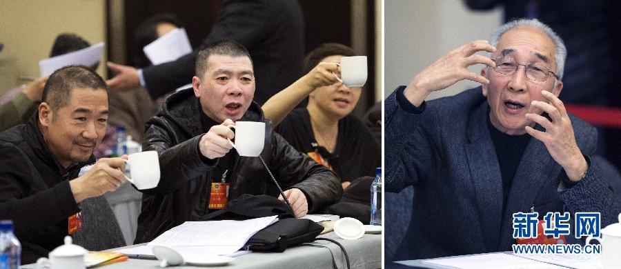 右图:靳尚谊委员在文化艺术界小组会上说,包括电影和绘画在内的所有艺术,在创作的过程中,艺术家都需要一个自由的创作环境。左图:冯小刚委员提议在场的电影人以茶代酒感谢靳尚谊委员对他们的理解与支持(拼版照片,3月6日摄)。新华社记者李学仁摄