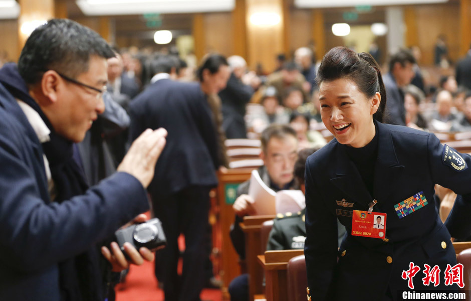 3月7日,全国政协十二届一次会议在北京人民大会堂举行第二次全体会议,多名政协委员就有关议题作大会发言。宋祖英委员出席会议并与其他委员打招呼。中新社发 盛佳鹏 摄