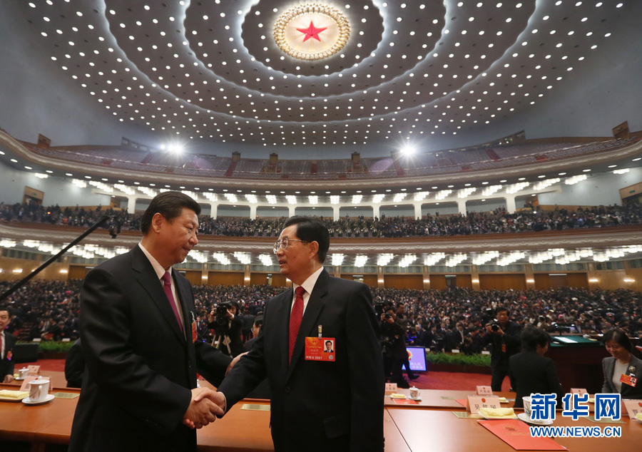 3月17日,第十二届全国人民代表大会第一次会议在北京人民大会堂举行闭幕会。这是习近平与胡锦涛亲切握手。新华社记者 兰红光摄