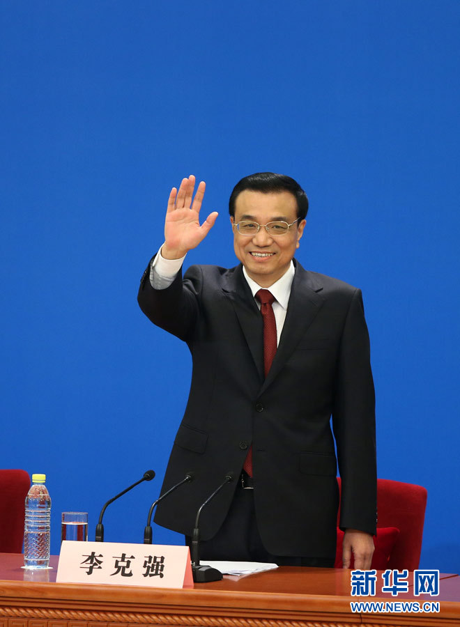 3月17日,国务院总理李克强和副总理张高丽、刘延东、汪洋、马凯在北京人民大会堂与中外记者见面,并回答记者提问。这是李克强向在场记者挥手致意。新华社记者 陈建力 摄