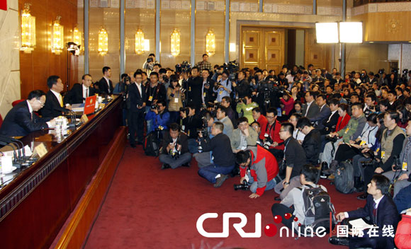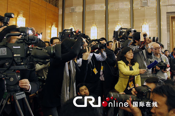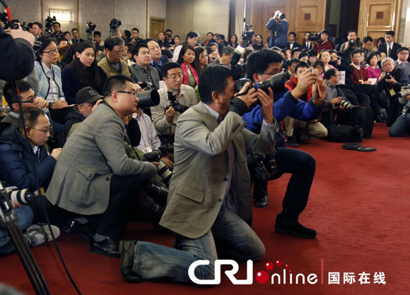 3月2日,全国政协十二届一次会议新闻发布会在人民大会堂召开。会场内,媒体记者纷纷抢占有利“地形”,或是早早地架起“长枪短炮”,两会媒体大战正式打响。