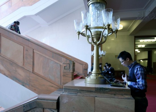 这是一名记者在人民大会堂内的楼梯旁工作。 新华社记者 兰红光 摄