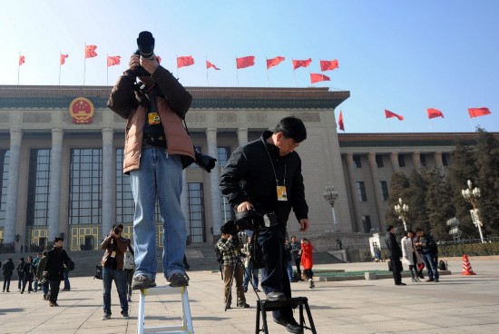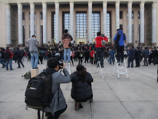 这是开幕会后,记者在人民大会堂外采访。 新华社记者邢广利摄