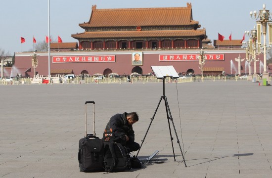 这是一名记者在天安门广场上准备采访工作。 新华社记者邢广利摄