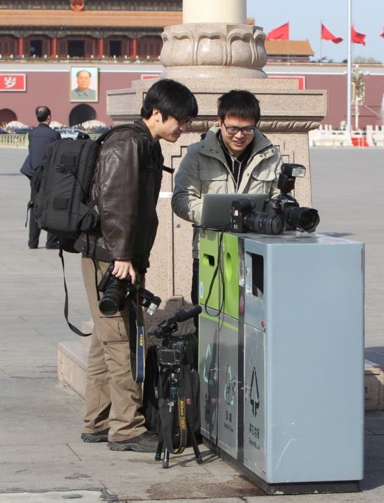 这是记者在天安门广场上发稿。 新华社记者邢广利摄