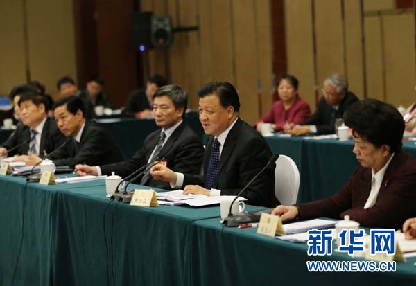 3月4日,中共中央政治局常委、中央书记处书记刘云山看望出席全国政协十二届一次会议的工会、共青团、青联、妇联界委员并参加联组会。新华社记者 刘卫兵 摄