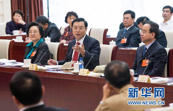 3月4日,中共中央政治局常委、国务院副总理张德江看望出席全国政协十二届一次会议的民革、台盟、台联界委员并参加联组会。 新华社记者 王晔摄
