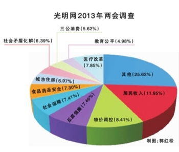 在光明网发起的2013年两会热点调查中,“居民收入”“物价调控”“医疗改革”“反腐倡廉”“社会保障”“城市住房”依然是网民热议的焦点。