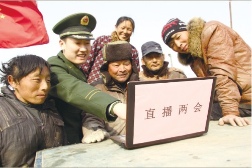 3月5日,为及时让辖区渔民关注两会最新动态,江苏海警支队发动全体官兵组成“两会放映队”,开进沿海各大渔港,让渔民群众不上岸就能收看两会。图为江苏省连云港市高公岛渔港的渔民和海警官兵一起通过无线上网的方式在渔船上观看全国人大会议开幕。许宁/人民视线