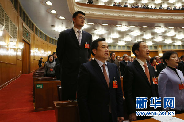 3月3日,中国人民政治协商会议第十二届全国委员会第一次会议在北京人民大会堂开幕。这是全国政协委员姚明在唱国歌。 新华社记者陈建力摄