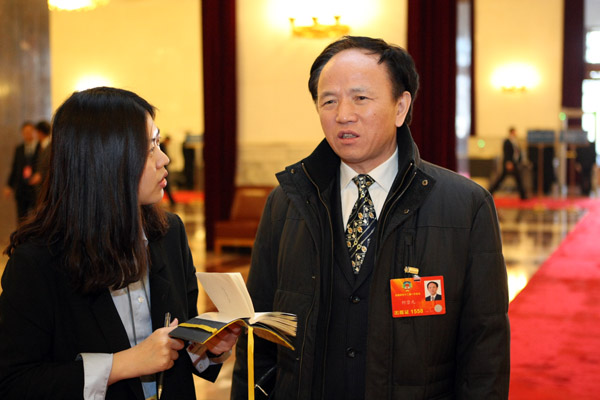 3月3日,何崇元委员接受记者采访。新华网/中国政府网 记者杨理光摄