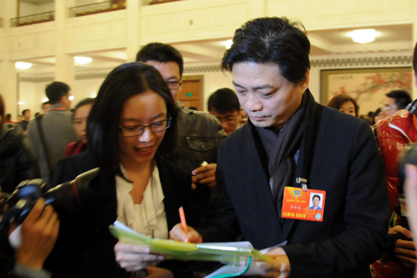 3月3日,崔永元委员为新华微博题字。新华网/中国政府网 翟子赫摄