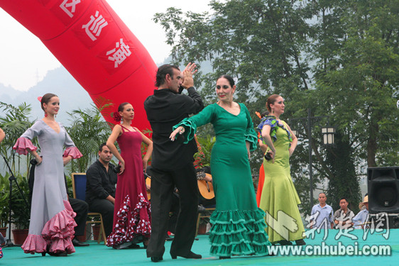 9月17日上午,长阳清江古城广场戏台前人声鼎沸,热闹非凡。众多古城居民和游客聚集在古城广场上,争相观看由澳大利亚“电声飞扬”摇滚乐队、西班牙胡莉娅·格雷格斯弗拉明戈舞团、蒙古国国家歌舞团、捷克萨拉吉卡舞蹈团、俄罗斯彼特尼茨基国家模范艺术团,以及长阳本土的壶口湾老年艺术团等近百名中外艺术家带来的精彩演出,从而拉开了第九届中国国际民间艺术节“观宜昌秀美风光,品国际文化盛宴”巡演的序幕。