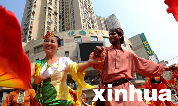 当日,巴基斯坦国家艺术团来到湖北宜昌解放路步行街,与当地市民进行民俗艺术表演交流。这是第九届中国国际民间艺术节的一部分。
