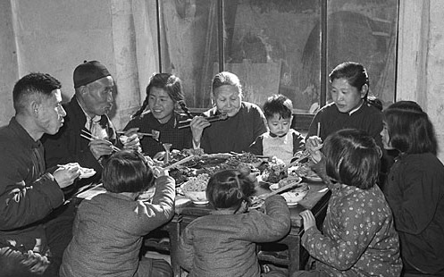 除夕之夜,家人团圆,守岁围炉,温情四溢。图为1953年春节,天津市汉沽区芦台王德铸(左一)一家人吃团圆饭。
