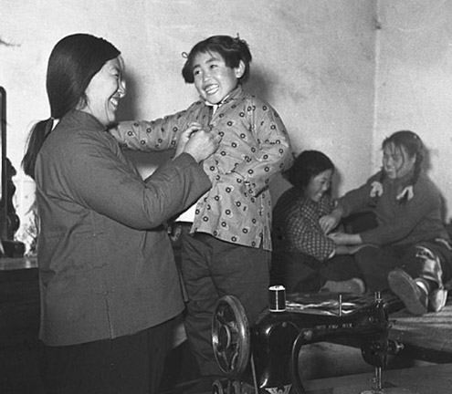 1954年春节,河北省唐山解家套农业生产合作社的小女孩陈小翠正在试穿妈妈刚做好的新衣。