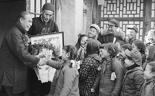 1955年春节,北京市的小学生们慰问军人家属洪老先生和洪老太太。