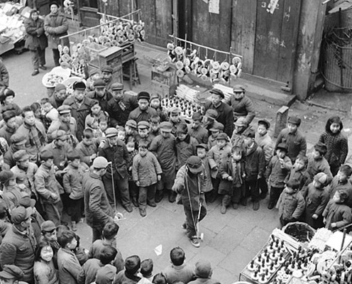 1957年春节期间的上海街头。扯铃摊上发出一片嗡嗡声,吸引了不少小顾客。