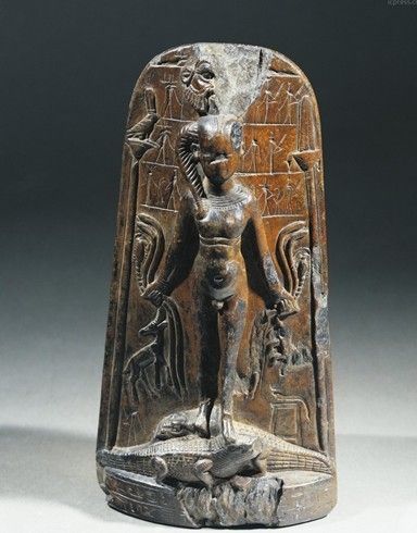 古埃及石碑,碑身刻有古埃及太阳神何露斯,双手各抓两条毒蛇,周身被咒语包围,石碑被修行者用来练习抵御野兽的魔法,古埃及文明,公元前5世纪。