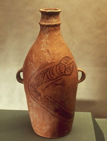 绘有有足图案的双耳细颈椭圆陶土罐,中国史前时期,公元前3000年