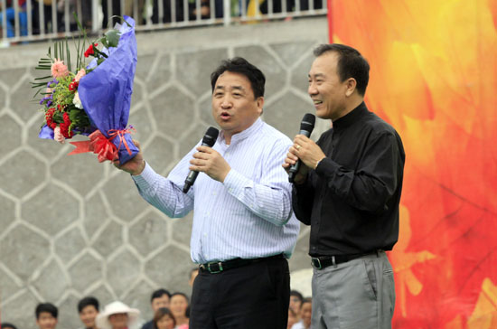 著名相声表演艺术家姜昆、戴志诚表演相声《笑在其外》。中国文艺网 白伟 摄