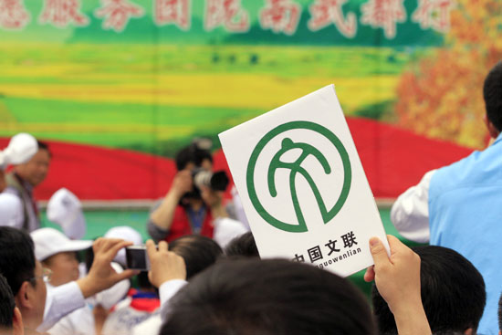 现场观众挥舞印有中国文联的logo的牌子。中国文艺网 白伟 摄