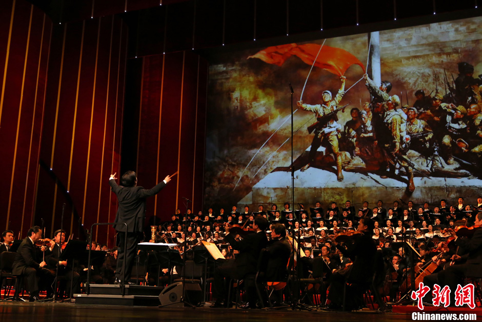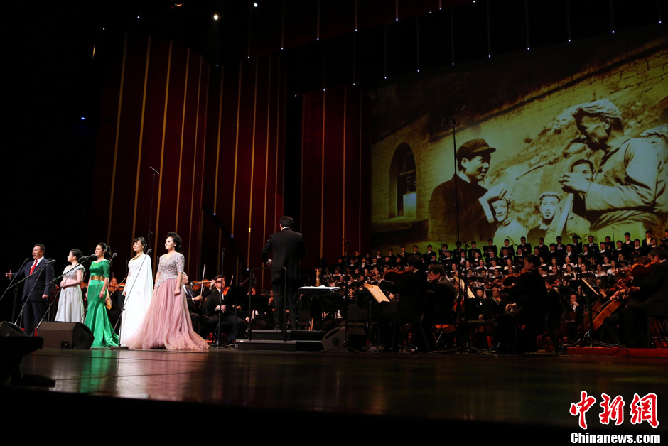 12月25日,身着红军服装的歌唱演员演唱歌曲《红军想念毛泽东》。当晚,《人民的毛泽东》纪念毛泽东诞辰120周年音乐会在国家大剧院举行,上千名首都各界群众共同观看了这台音乐会。中新社发 李慧思 摄