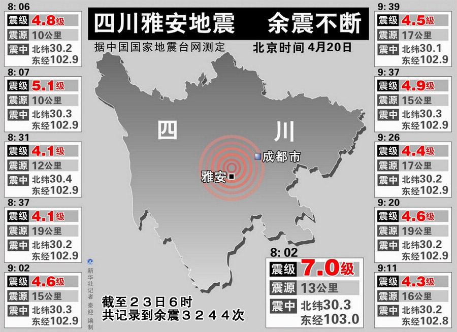 四川省雅安市芦山县发生7.0级地震后,中共中央总书记、国家主席、中央军委主席习近平,中共中央政治局常委、国务院总理李克强分别作出重要指示,要求抓紧了解灾情,把抢救生命作为首要任务,千方百计救援受灾群众,科学施救,最大限度减少伤亡,同时加强地震监测,切实防范余震带来的次生灾害,妥善做好受灾群众安置工作,维护灾区社会稳定。