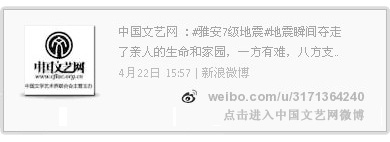 中国文联谨向你们并通过你们向雅安灾区人民、向四川广大文艺工作者表示诚挚慰问!一方有难,八方支援。我们相信,在以习近平同志为总书记的党中央的坚强领导和亲切关怀下,在全国人民的大力支持下,灾...
