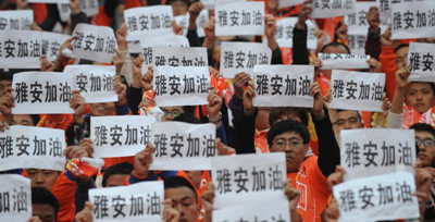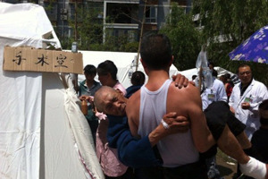 【余震中为保群众两名武警受伤】21日12时12分左右,在刚刚打通的芦山县城通往重灾区太平镇的道路上,突发余震。为了让群众在落石区先行通过,作为安全员的武警交通部队少校工程师宋永科被落石击中头部,一级士官燕凯凯被击伤后跌落山坡,全身多处受伤。——群众有难,人民战士保护你!一方有难,八方支援,全国人民会支援你!芦山,不要怕,不管悲伤还是痛,我们都会陪着你,和你们在一起!