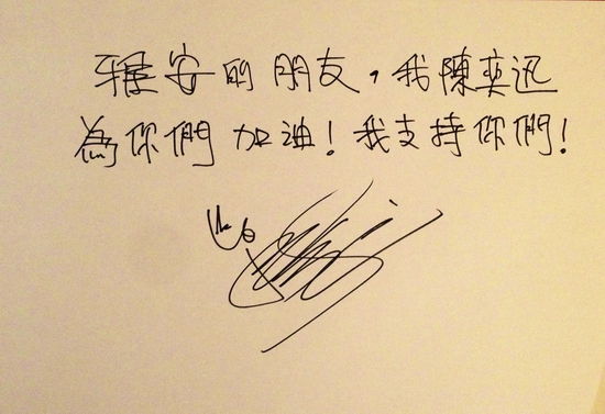 陈奕迅为灾区人民加油打气。