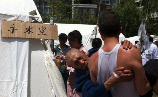 20日,四川省雅安市芦山县(北纬30.3,东经103.0) 发生7.0级地震后,大量伤员送至雅安芦山县医院,因医院受损严重,在一搭建的临时帐篷医院手术室外,一儿子抱着父亲等待手术,没座位,儿子足足抱了他一小时。儿子说,不累!
