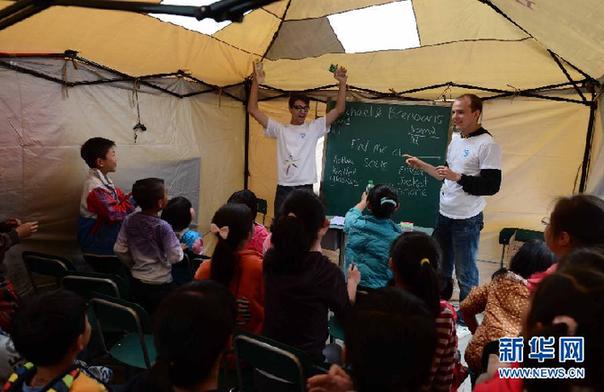 4月22日,来自西南财经大学的两名外国留学生志愿者在芦山中学的帐篷内给学生们上英语课。当日,来自西南财经大学的17名大学生志愿者在四川省芦山中学搭建起帐篷和课桌椅,为中小学生辅导功课。目前,芦山地震灾区的学校尚未复课。新华社记者 江宏景摄