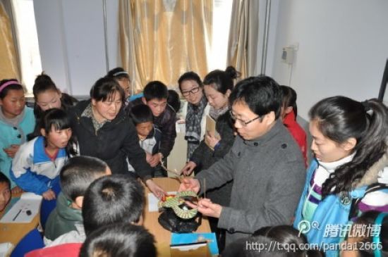 志愿者谢玉强给孩子展示手工