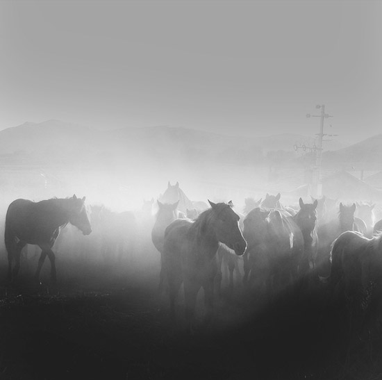 我生在内蒙古,成长在内蒙古,从2009年开始拍摄蒙古马,对蒙古马的生存环境、生存习俗、生存现状进行了考察体验,对蒙古马有一种深深地眷恋。记得有一次我在拍摄蒙古马赛马,眼前两百多匹蒙古马从我身前两边擦身而过,没有碰撞我一下,使我震惊,让我感动。(王争平)