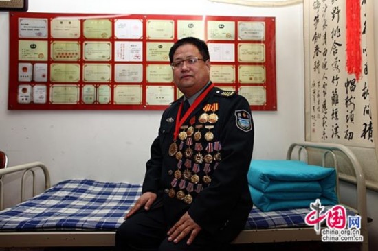 2014年3月2日,朱良玉的床就在他的书桌旁,被子叠成了类似军被的“豆腐块”。床前的墙上贴着近年获得的各种荣誉证书。中国网 陈维松 摄