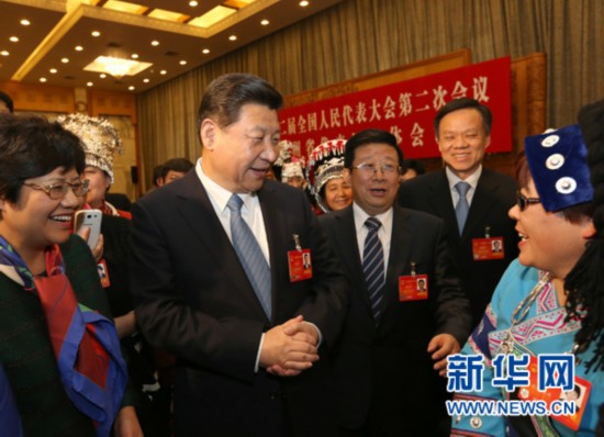 3月7日,中共中央总书记、国家主席、中央军委主席习近平参加十二届全国人大二次会议贵州代表团的审议。这是习近平来到女代表中间,同她们亲切交流,并表示,明天就是国际劳动妇女节,借此机会,代表党中央、国务院,向女代表、女委员及全国各界妇女同胞,致以节日的问候。新华社记者刘卫兵摄